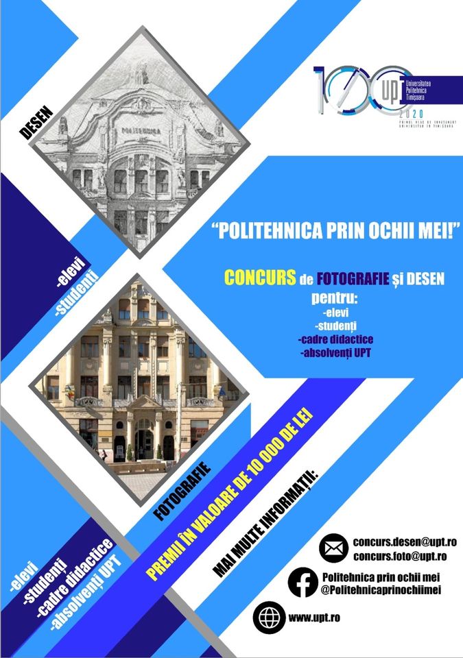 În data de 11 noiembrie 2020, Universitatea Politehnica Timișoara împlinește 100 de ani de la înființare. Cu această ocazie UPT lansează o provocare elevilor (potențiali viitori studenți), studenților, cadrelor didactice și absolvenților UPT: să-și exprime propria viziune, creativă, asupra Politehnicii, în cadrul concursului de desen/schițe și fotografie „POLITEHNICA PRIN OCHII MEI”, care demarează la data de 1 septembrie 2020, dotat cu premii totale în valoare de 10.000 de lei.