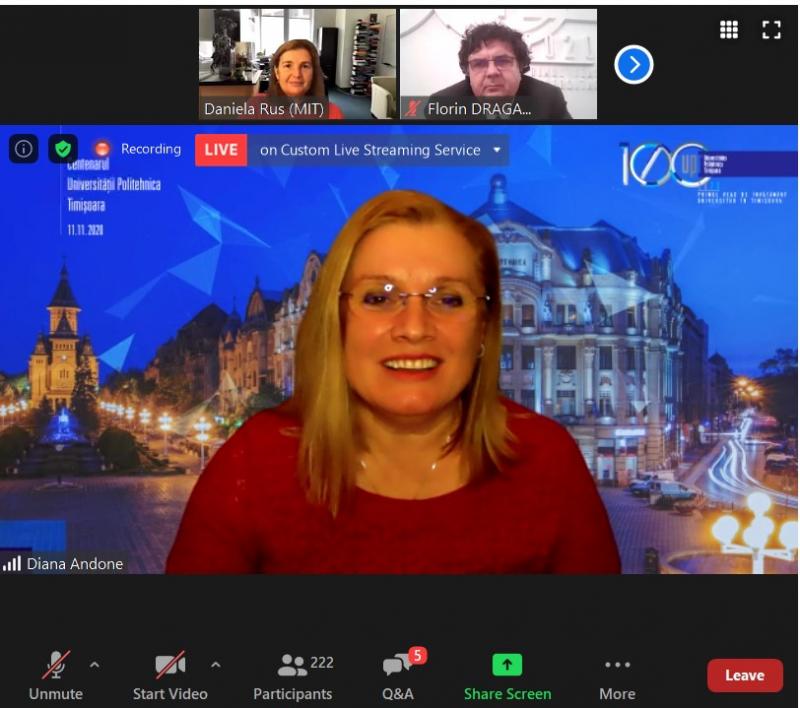 Senatul Universității Politehnica Timișoara a acordat miercuri, 18 noiembrie 2020, titlul de Profesor Onorific al Universității Politehnica Timișoara directorului Computer Science and Artificial Intelligence Laboratory de la MIT – Prof. Daniela Rus. Ceremonia de decernare a avut loc online, în cadrul celei de-a XVIII-a ediții a webinariilor Împreună Online și a fost oficiată în prezența conducerii UPT, a membrilor Senatului și Consiliului de Administrație UPT și a peste 400 de participanți din România, Europa și SUA.