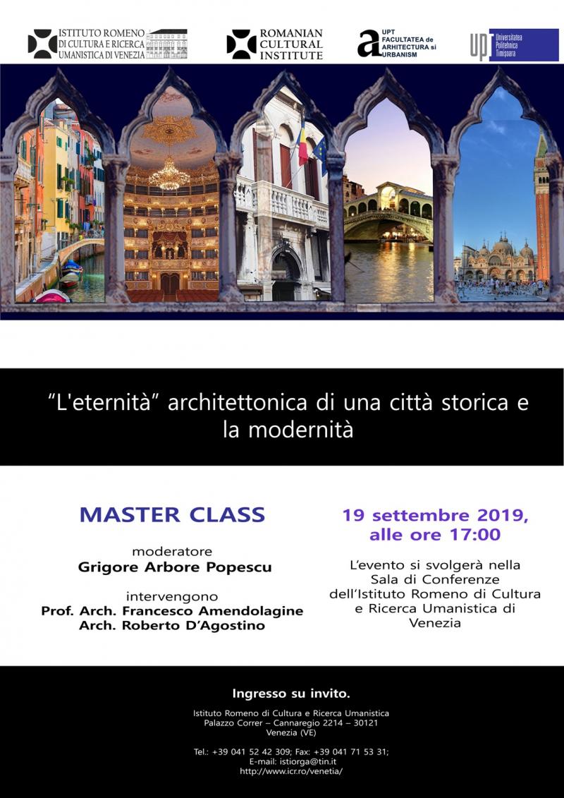 Institutul Român de Cultură și Cercetare Umanistică de la Veneția, în colaborare cu Universitatea Politehnică Timișoara (UPT) și Facultatea de Arhitectură și Urbanism din cadrul UPT, au organizat o întâlnire de lucru tip master-class, formată din trei intervenții-pilot asupra cazului particular al Veneției în imaginația colectivă și în istoria urbanismului și arhitecturii.