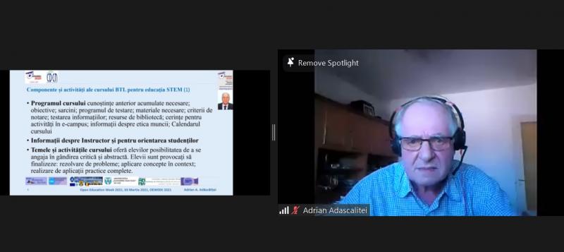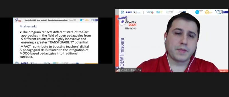 16 international speakers presented, on Wednesday, March 3, 2021, the latest updates related to open education in Romania and the EU in the workshop organized under the auspices of Open Education Week 2021. The event was organized by Politehnica University Timisoara, through the ID/IFR and e-Learning Center with the support of the EDEN and IEEE Romania associations, being part of the UPT Together Online webinars.