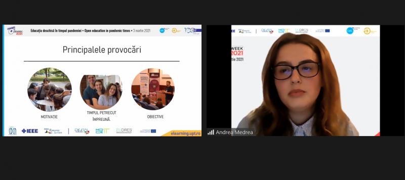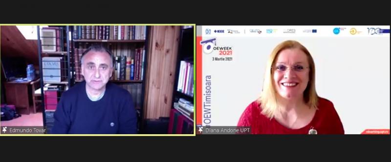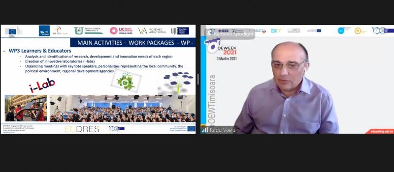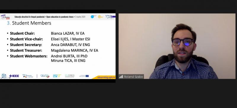 Among the presenters were: Dr. Eng. Diana Andone, Ph.D., director of CeL-UPt, with a presentation on Open Education and the impact on the digital education ecosystem, collaboration between universities, schools, non-governmental organizations and professional associations, involvement of EDEN and IEEE, but also on virtual mobility and micro-credits developed in projects such as Open Virtual Mobility, TalkTech and Digital Certificates awarded within them; Prof. Dr. Ulf-Daniel Ehlers, Ph.D., Baden-Württemberg Cooperative State University, who captured the audience with a snapshot of future competencies and how higher education will evolve in the future, Dr. Sandra Kučina Softić, Ph.D., President of EDEN, who pointed out the contributions of EDEN to Open Education, Michael Gaebel, director of the Higher Education Policy Unit and Alison Morrisroe, head of policies and projects at the Higher Education Policy Unit, European University Association (EUA), who offered the audience a series of reflections on strategic approaches for digitally enhanced learning and teaching, prof. eng. Radu Vasiu, Ph.D., president of the Senate of Poitehnica University Timișoara, who presented the revolutionary initiatives of the European Universities and the E³UDRES² - digital project; Prof. Eng. Adrian A. Adascăliței, Ph.D., „Gheorghe Asachi” Technical University in Iași, who presented a series of mixed and hybrid teaching and learning methods in the education programs for Science, Technology, Engineering and Mathematics (STEM); Assoc. Prof. Gabriela Grosseck, Ph.D., West University of Timisoara showed how creativity can be promoted through the use of RED; lecturer eng. Silviu Vert, Ph.D., UPT, who led the audience through a series of simulations and virtual labs run with UPT students; Professor Cengiz Hakan AYDIN, Ph.D., Anadolu University of Turkey and lecturer eng. Vlad Mihăescu, Ph.D., UPT, presented the MODE - IT project and MOOC instructional technologies for university education; prof. eng. Carmen Holotescu, Ph.D., Ioan Slavici University in Timişoara, listed and explained the series of initiatives in Romania related to Blockchain in education, lecturer eng. Andrei Ternauciuc, UPT, presented the UPT Virtual Campus - the digital educational tool that made digitalization possible in UPT; Alexandru Luca, the president of the Student organization from the Faculty of Automation and Computers (Liga AC) - UPT, explained to the audience how we can take education outside the university benches; Andrea Medrea, president of the students organization from ETCTI - UPT, reported the effect of the online environment on volunteer activities and associate professor Roland Szabo, Ph.D., IEEE & RAS member, EPS Advisor IEEE Student Chapter at UPT, spoke to the participants about the Robotics and Automation Society - IEEE, the Electronic Packaging Society - IEEE and the IEEE Student Chapter at UPT.