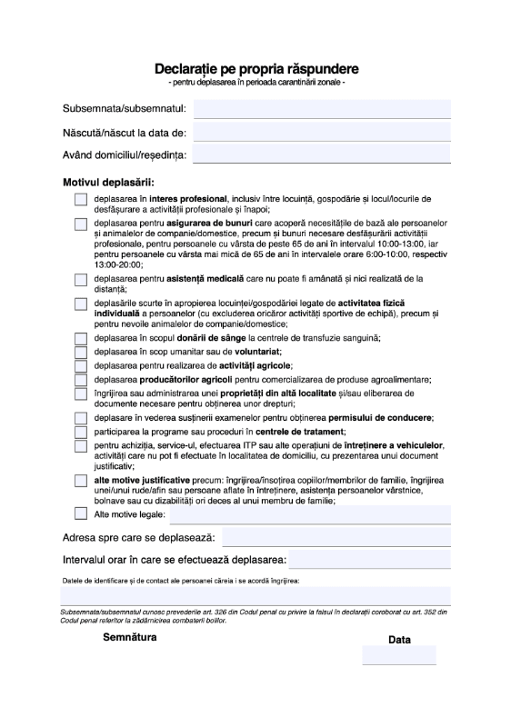 - The movement of people in public spaces, inside the quarantined area, is prohibited, except for well-justified reasons, based on the declaration, the employee ID or the certificate issued by the employer. The declaration on one's own responsibility must include the name and surname, date of birth, address of residence / place of professional activity, reason for travel, date of completion and signature, as well as the time interval necessary to carry out the activity;
